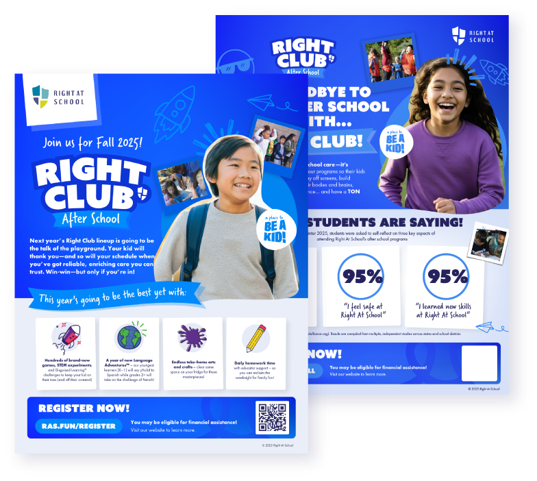 Brochures offer a more in-depth look at RAS programs than flyers or posters can offer. These brochures are a great way to inform families about the content of our programs and the benefits to kids and parents. They can help increase leads (potential new RAS parents), and contain information that remains relevant longer than flyers or posters.