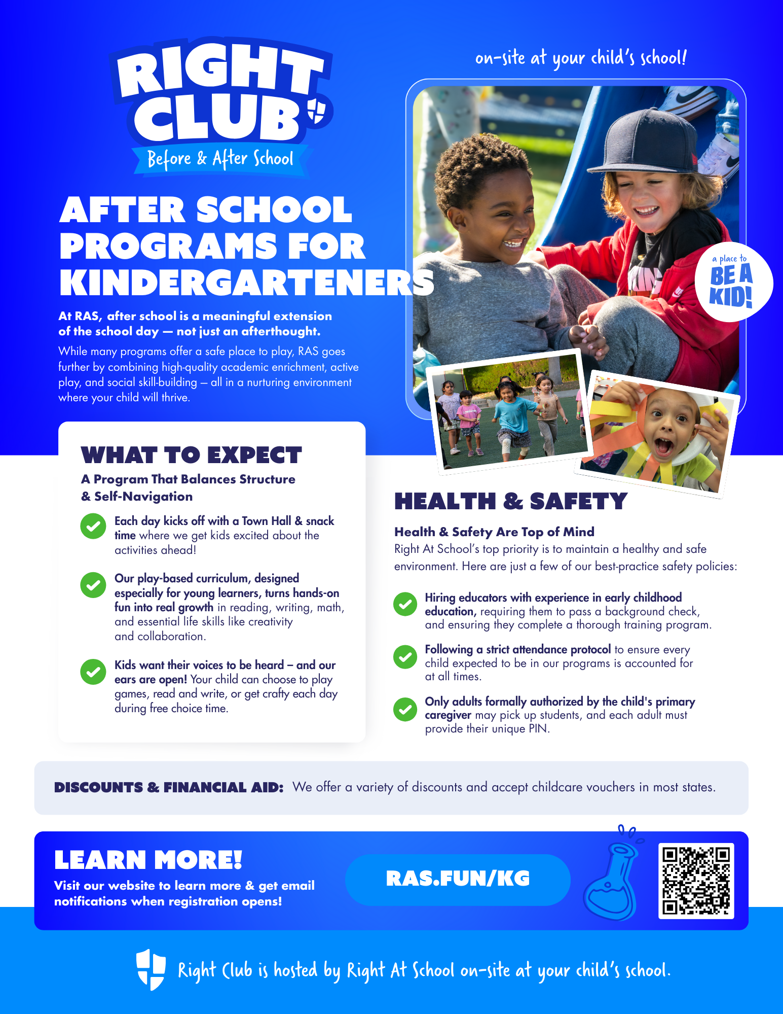 In our marketing, we highlight that our Before and After School programs as an affordable, flexible, and safe program where kids can go before and after school to learn, play, and grow!
